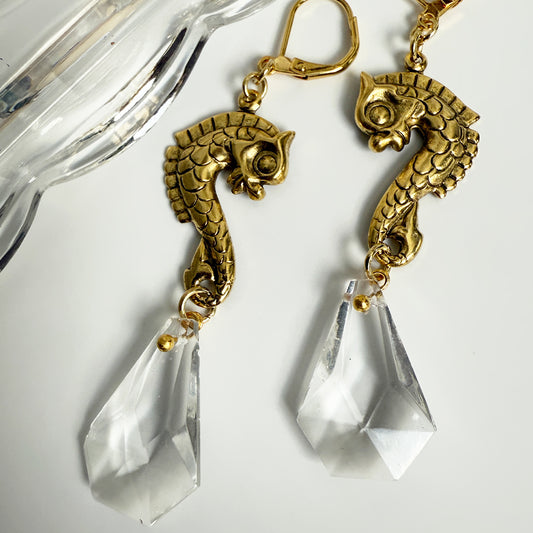 Unique and bold, perfect for the moon goddess in you! Shine bright like the moon with our Crescent Statement Earrings. Featuring carefully handcrafted wire wrapped faceted glass beads centered into textured gold crescent moon shapes.