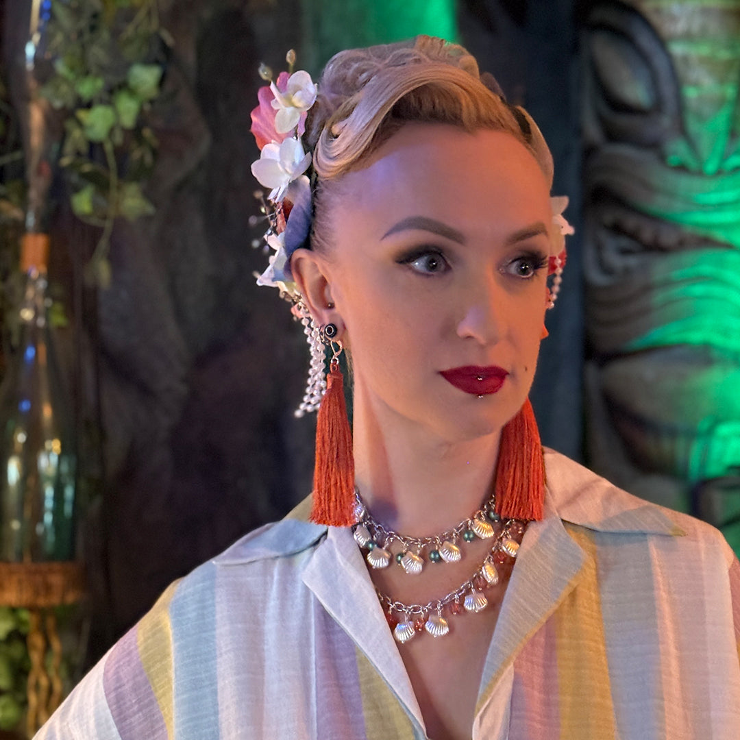 Collections inspired by tiki bars, torchlight, and tropical nights. Sculptural silhouettes meet retro glam.