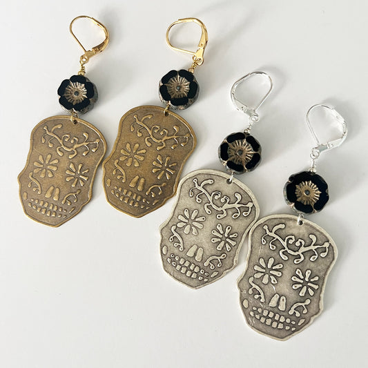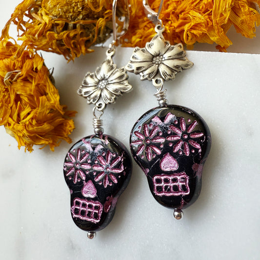 Sugar Skull & Flower Earrings SILVER & BLACK