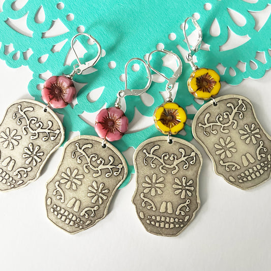 Sugar Skull & Flower Earrings SILVER & YELLOW
