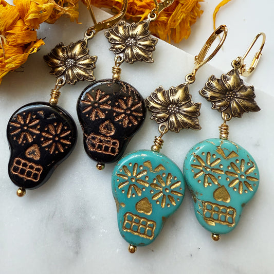 Sugar Skull & Flower Earrings GOLD & BLACK