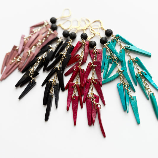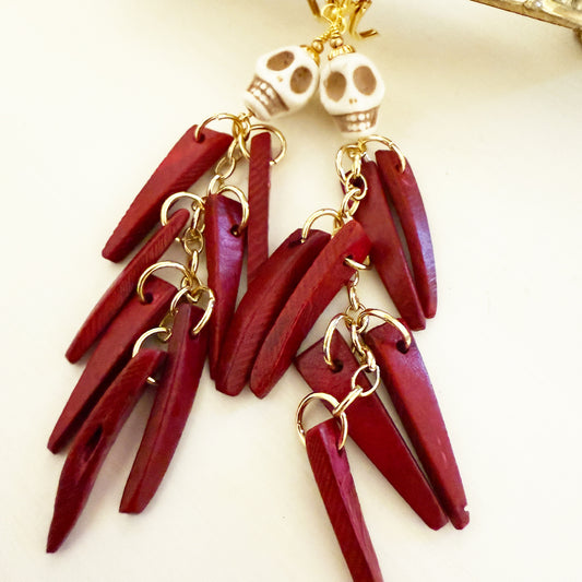 Colorful, Palm Fringe collection is inspired by tropical escapes. Each pair features layered, wooden charms, lava stone accents and fun skull motifs.
