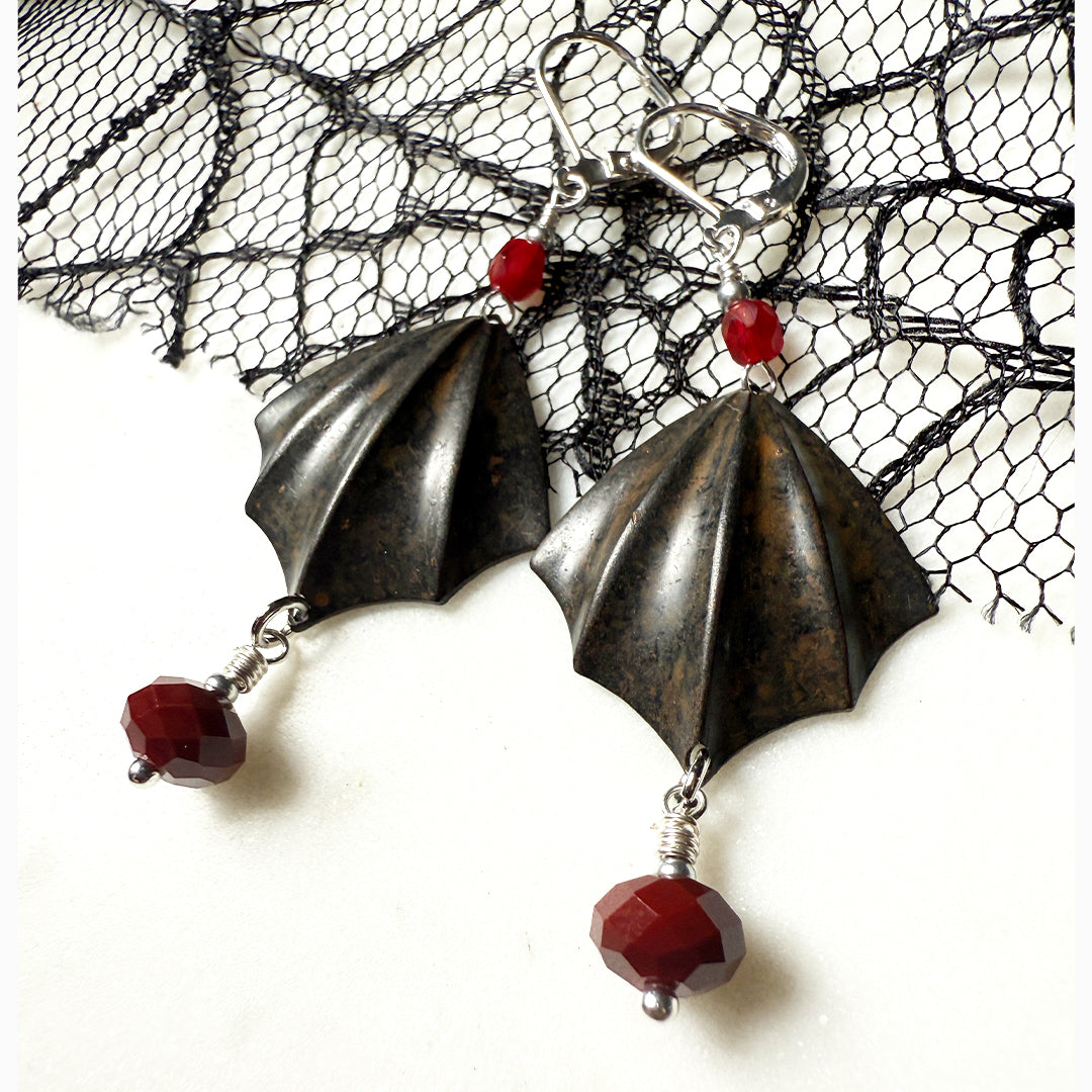 Beautifully rusty patina tone bat wing charms adorned with crimson matte glass faceted gems.
