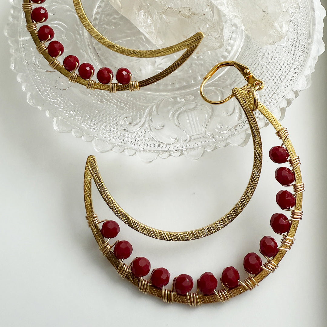 Gold crescent moon frames with matte deep blood red tone faceted glass beads.
