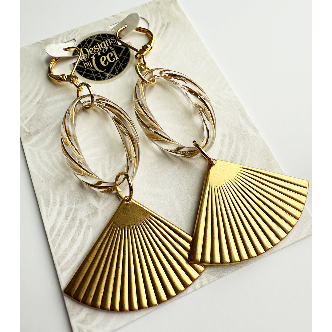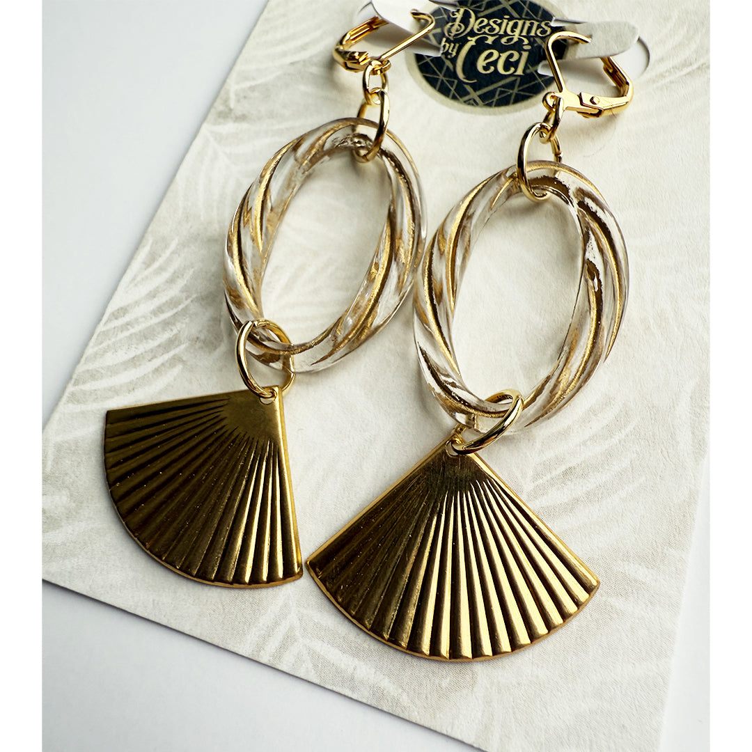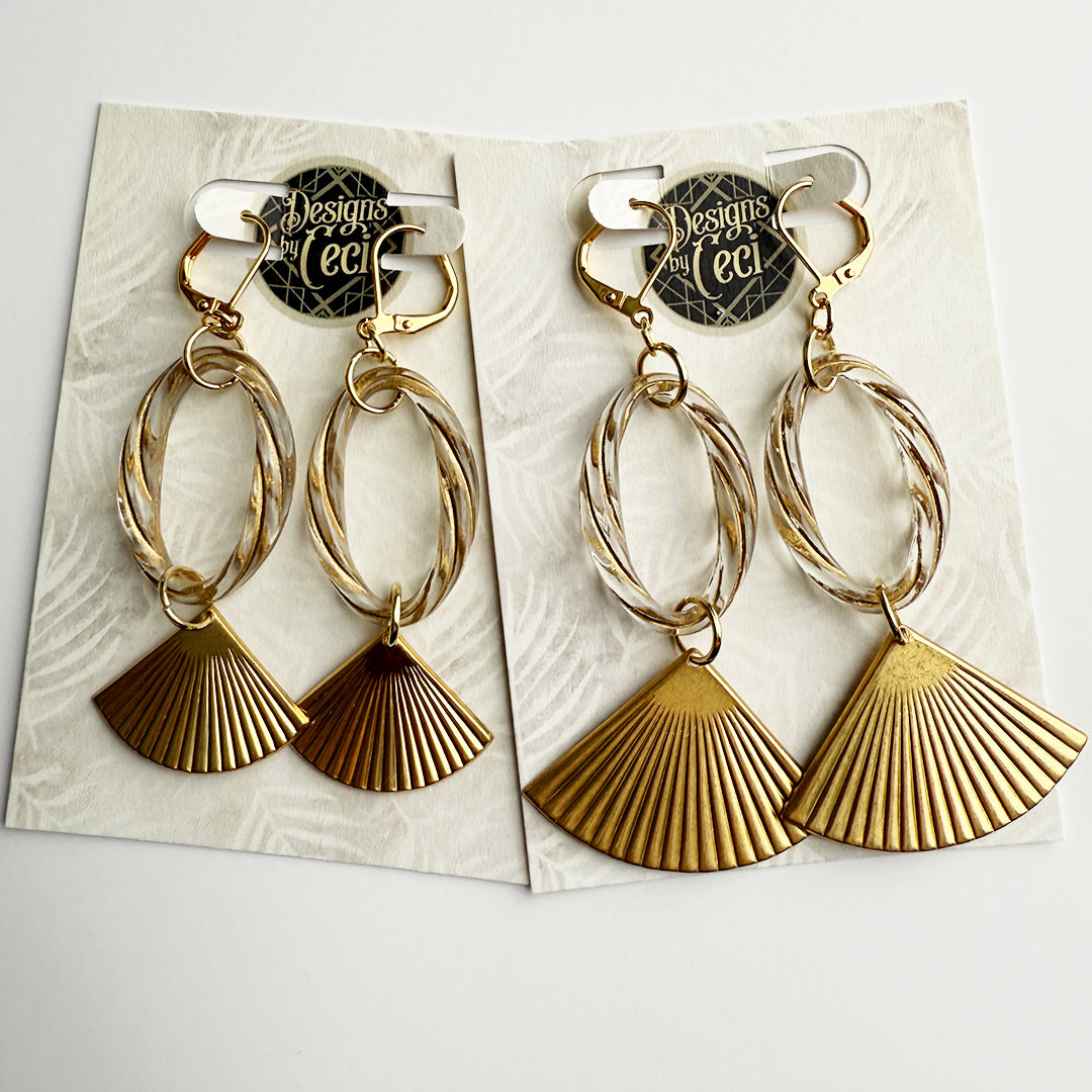 Acrylic clear hoops with golden streaks accented with golden tone brass fans. Small and large size shown in photo for size reference. The small size is 1 inch wide and large fan measures 1.5 inches wide. Each size has same length.