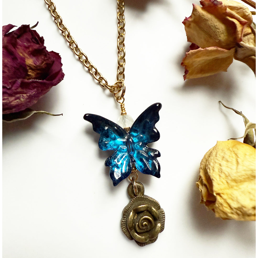Each glass butterfly charm features an antiqued rose charm, adding a luxurious vintage touch that contrasts with the moody tones of the wings.