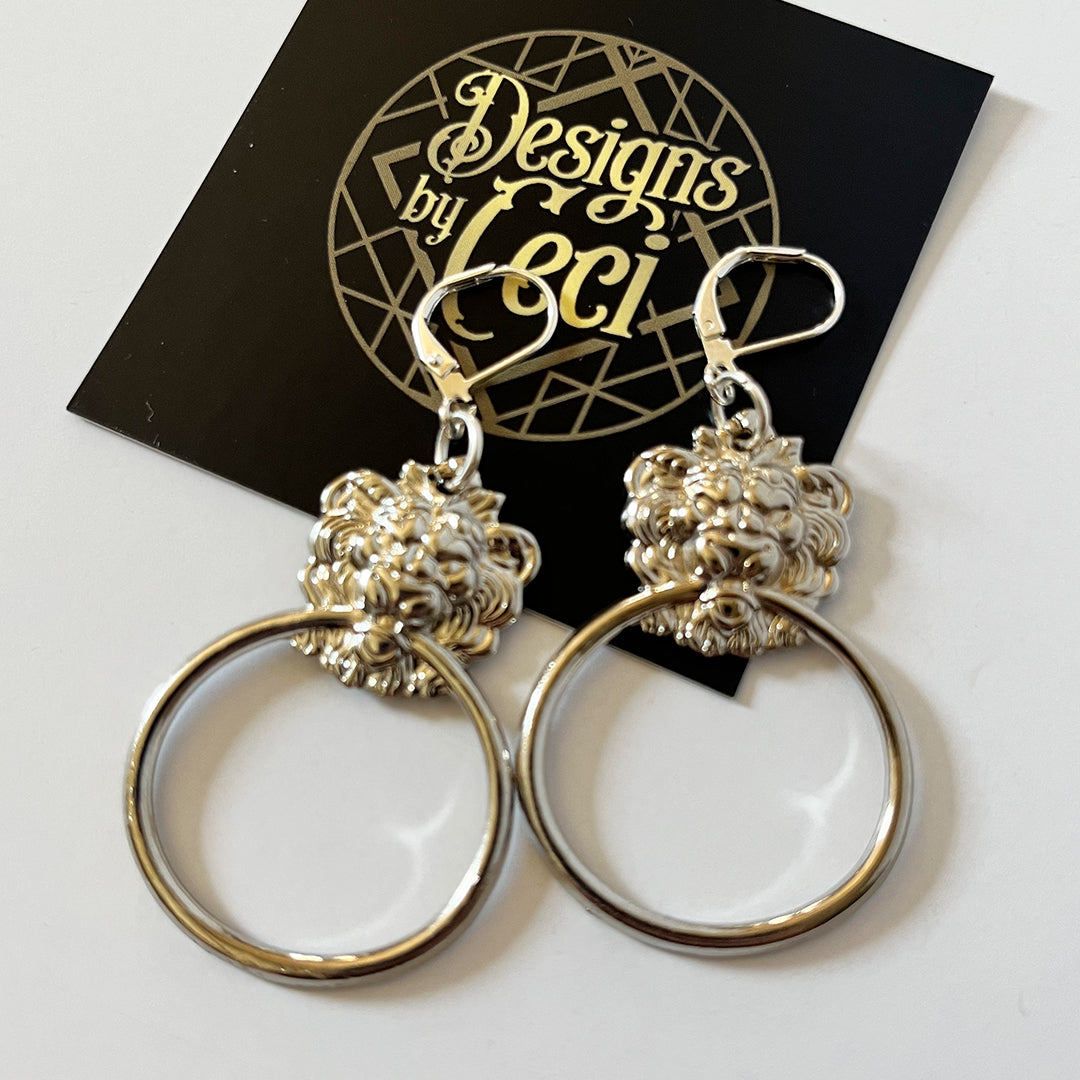 Step up your style to a regal welcome with these vintage silver-hued door knocker earrings, featuring a detailed lion holding an elegant hoop.