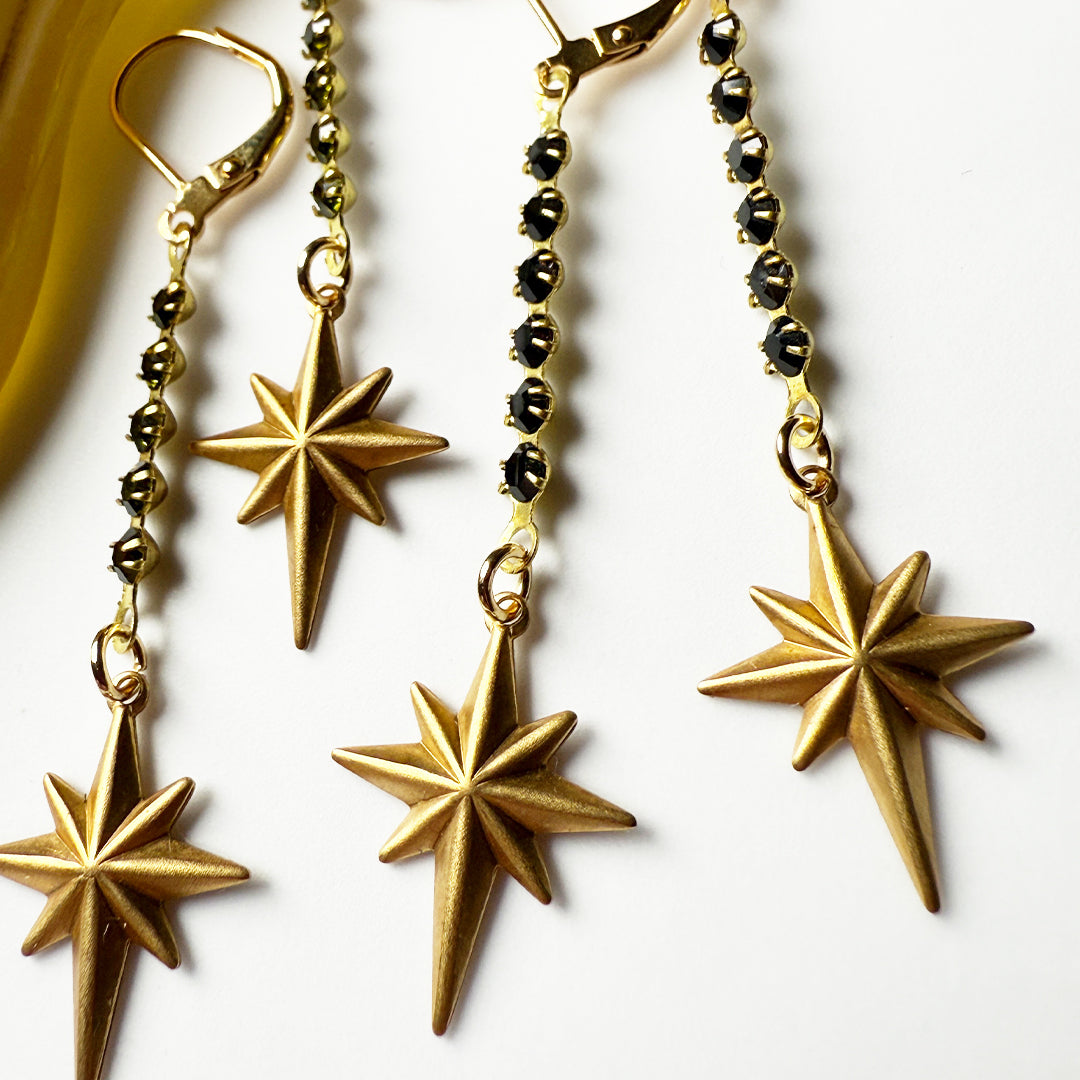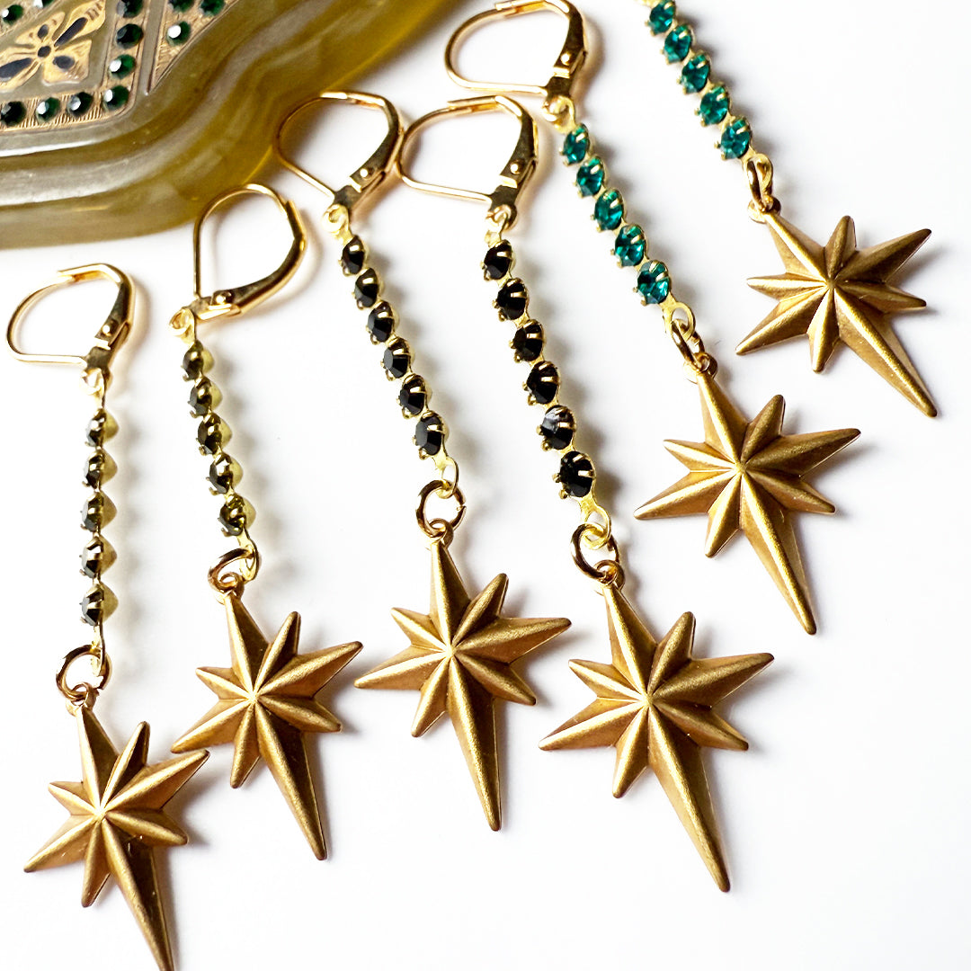 Each earring features a radiant eight-pointed star charm suspended from a sparkling line of rhinestones. The gold-tone finish and geometric lines capture the essence of 1920s Art Deco elegance, while the celestial motif adds a touch of cosmic wonder.