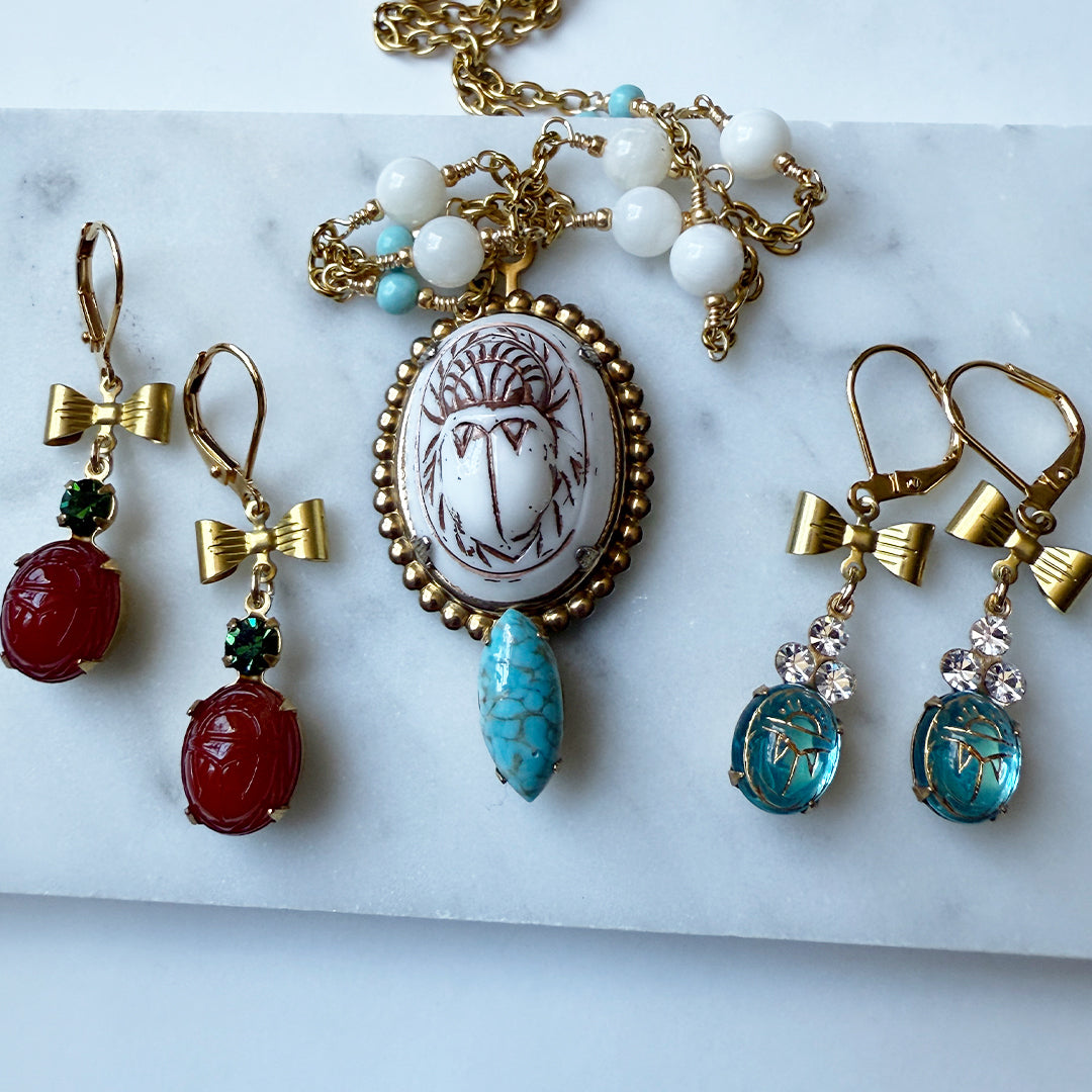 Inspired by the art, symbols, and aesthetics of ancient Egypt and current cinematic Scarab jewelry fashion trends.